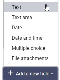 You can add basic text fields, Date and time fields, Multiple choice fields and File attachments.