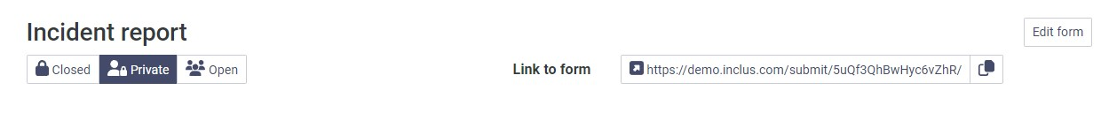 When you have finished editing the incident reporting form, you can then share it to your organization. If you set the form as private, all reporters need Inclus account for filling the form. If the form is set open, you can share the link freely in different channels, for example in your companys intra page to your organisation and stakeholders.